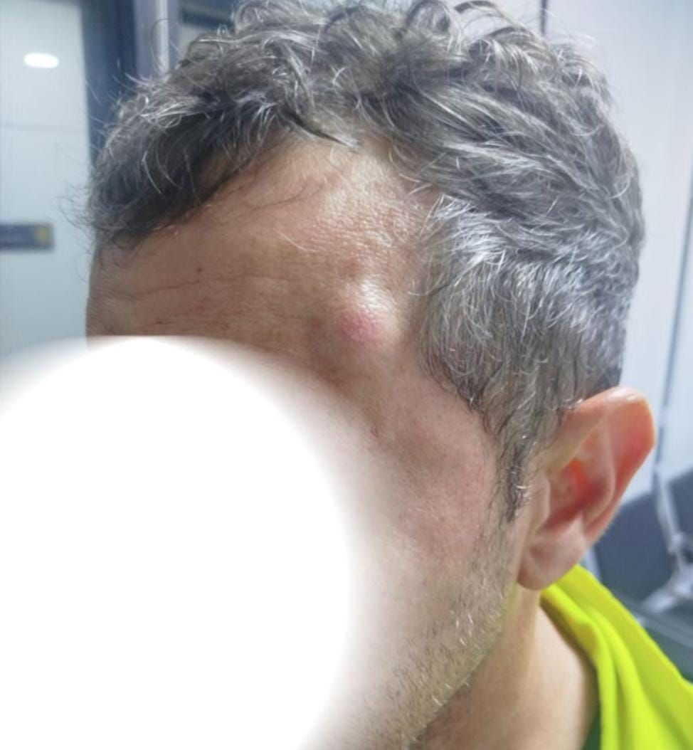 Na foto visualizamos o grau de violência praticado, após vários golpes no Agente, e a lesão no fronte que poderia resultar até mesmo na perda da vida do Agente.